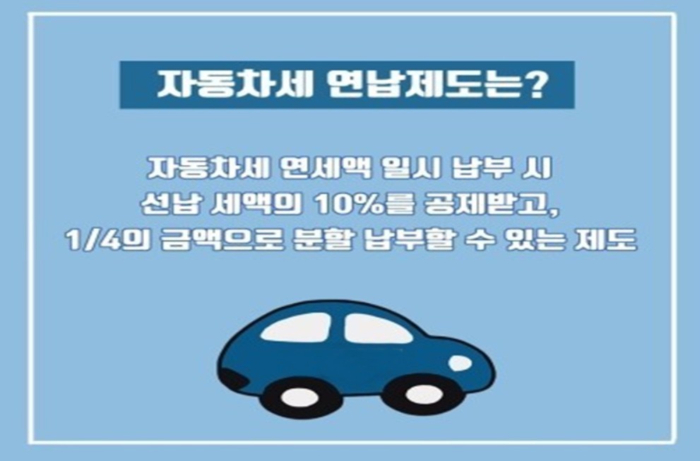 자동차세 연납 제도란 자동차세를 미리 납부 해서 세금을 할인받을 수 있는 제도입니다.