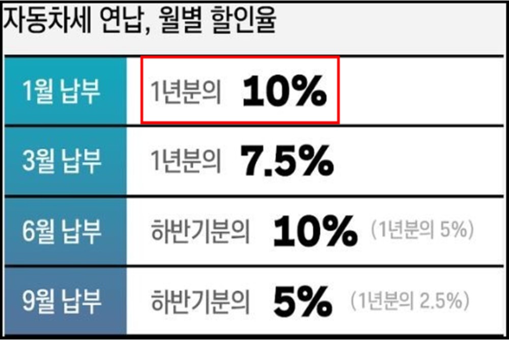 간단히 정리해 드리겠습니다. 자동차세 연납 제도를 이용하면 최대 10% 정도의 세금 할인을 받을 수 있습니다.