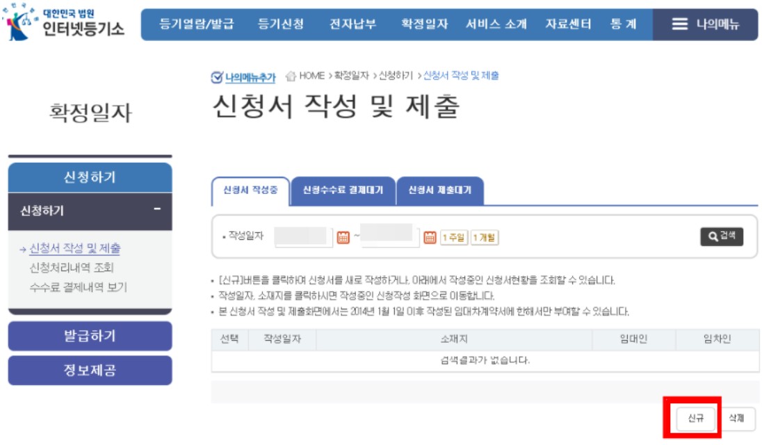 메뉴 잘 들어갔다면 우측 하단에 신규 버튼이 보일 겁니다. 신규 버튼을 클릭하고 신청서를 작성합니다.