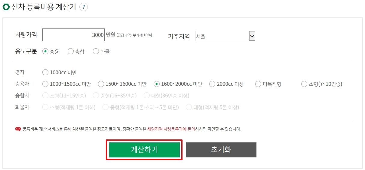 신차 등록비용 계산기를 이용하여 차량가격, 거주지역, 용도구분, cc, 를 각각 선택하여 '계산하기' 단추를 누릅니다.