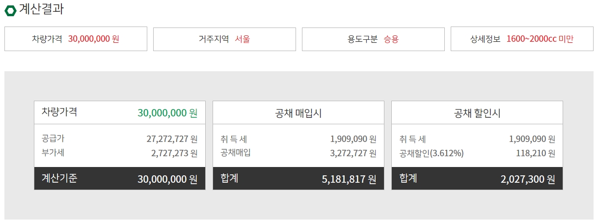 계산결과에서 공입시의 취득세, 공채 할인시의 취득세 합계를 확인할수가 있습니다. 여기서 취득세는 취등록세를 포함한 합계입니다.