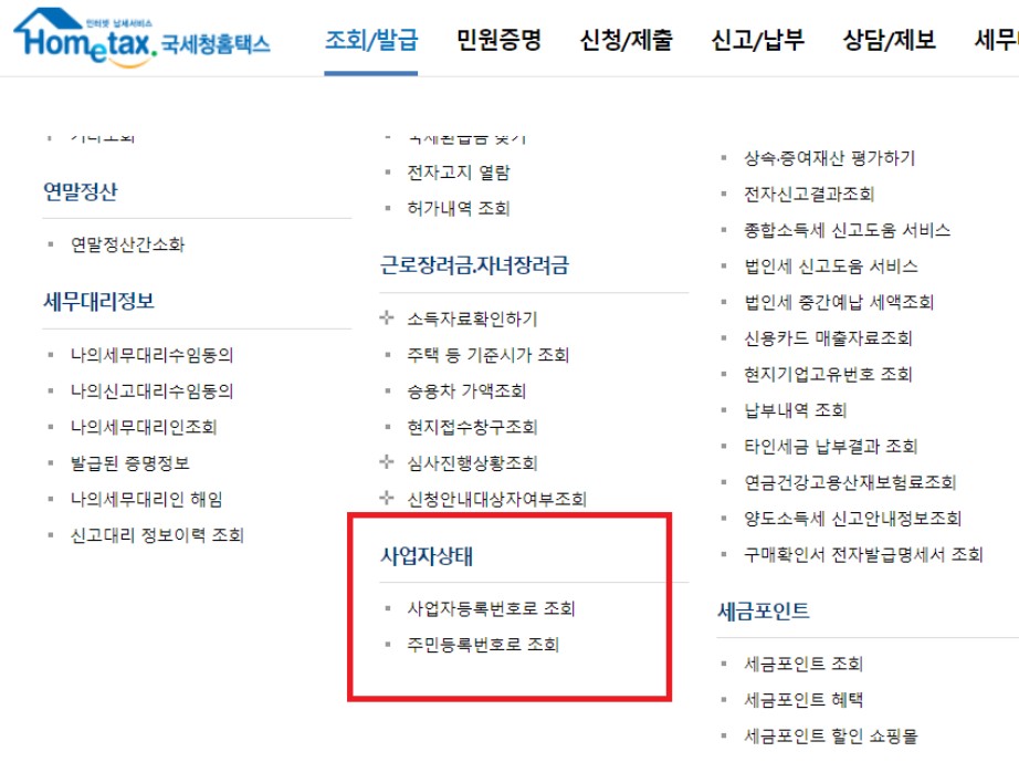 해당 메뉴에 속해 있는 여러 명이 둘 중에 사업자 상태 메뉴를 보시면 되는데요, 사업자등록번호 또는 주민등록번호로 사업자 상태를 조회할 수 있습니다.