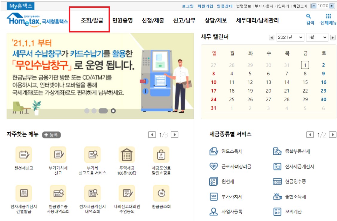 상단 메뉴 중 조회 발급 메뉴가 있는데요, 클릭해서 들어갑니다.