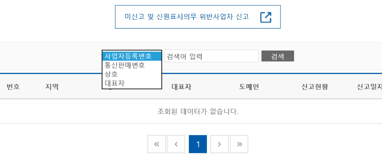 원하는 사업자를 선택했다면 위 사진과 같은 화면을 볼 수 있는데요, 통신판매번호나 상호, 대표자 중 하나를 입력한 후 검색하면 사업자등록번호를 조회할 수 있습니다.
