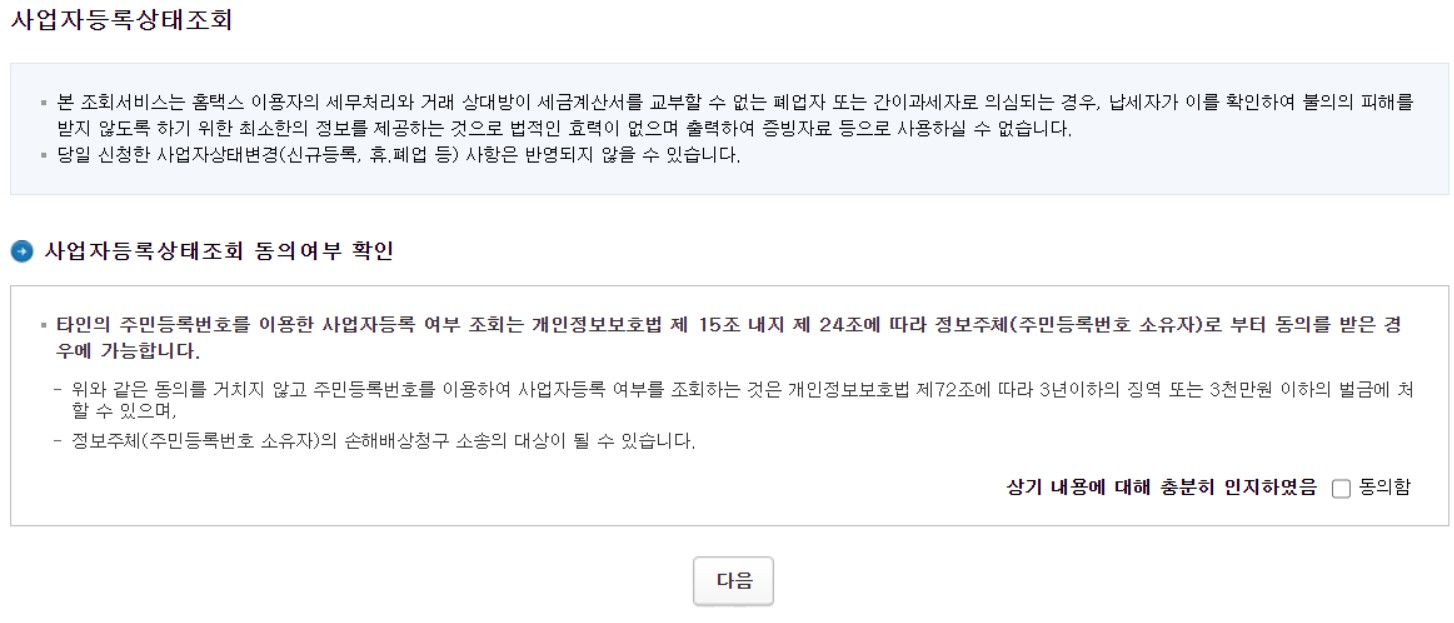 국세청홈텍스를 이용 하려면 사업자등록번호나 주민등록번호로 사업자 상태를 조회 하는 건데요, 개인 정보 보호법에 따라서 정보주체로부터 동의를 받은 경우에는 조회가 가능합니다.