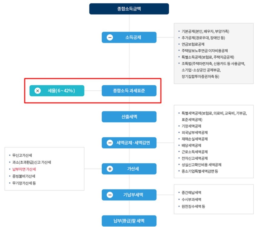 공제를 제외한 값이 과세표준이 됩니다. 과세표준에서 세율을 곱해야 하기 때문에 세금을 계산하는데 있어 소득세율은 중요한 부분을 차지합니다.
