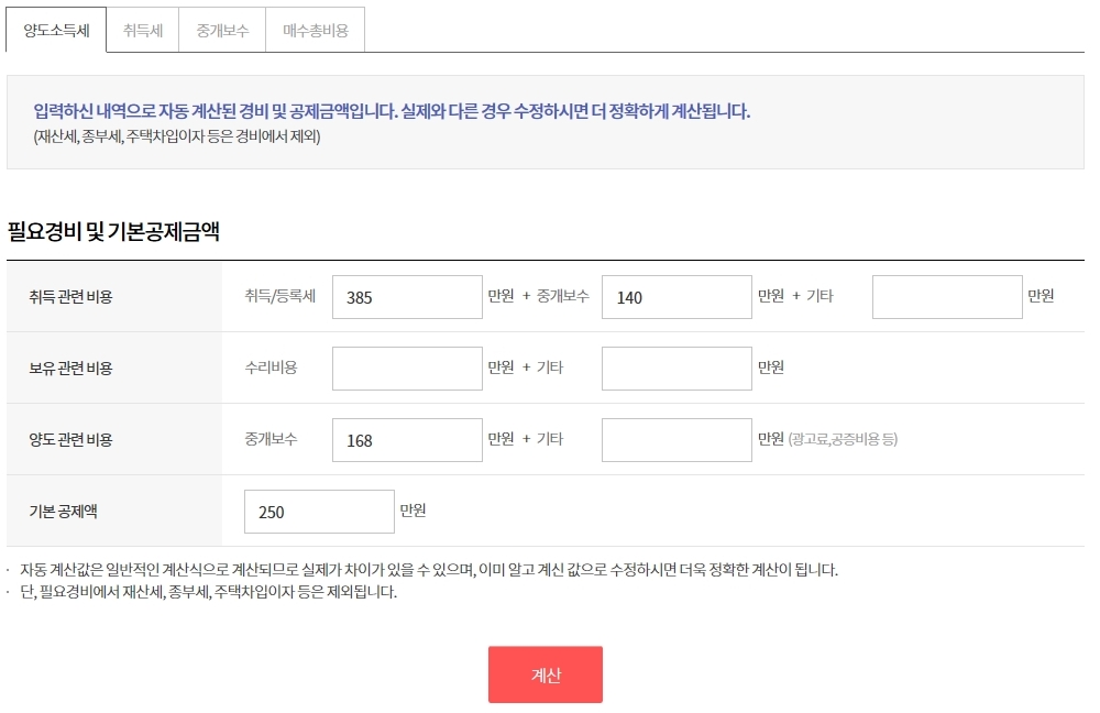 다음은 필요 경비 및 기본공제금액을 작성합니다. 수리비용이 따로 들거나 양도비용이 다르다면 수정하고 계산을 합니다.