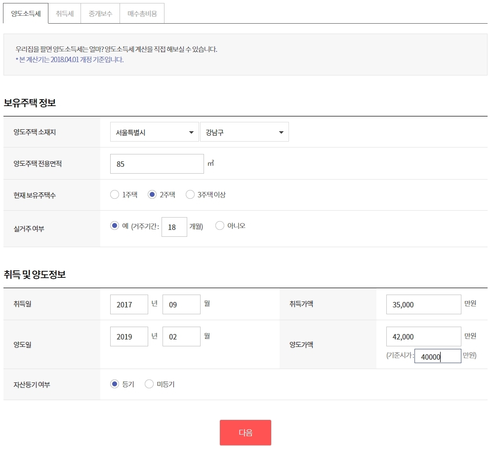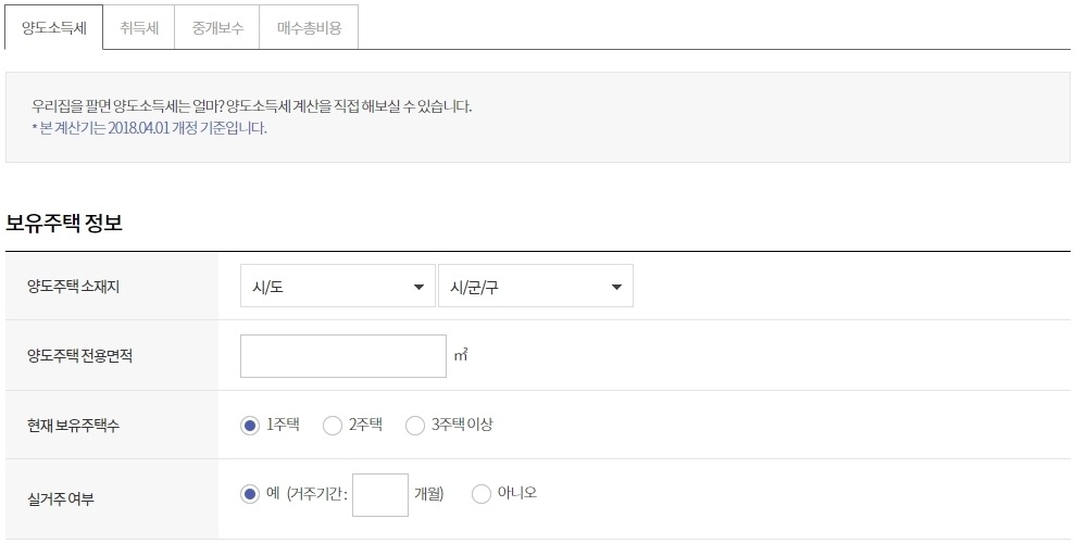 이곳에서 보유주택 정보, 취득 및 양도정보를 입력하면 됩니다. 현재 보유주택수를 꼭 설정해 주세요.