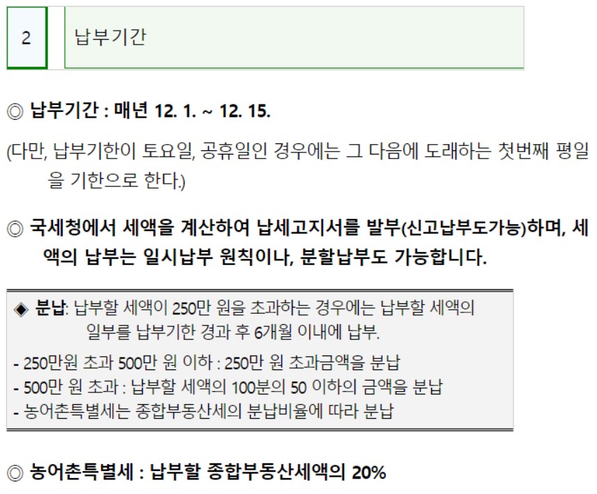 종부세 과세대상 이신분들은 국세청에서 납세고지서를 발부 합니다. 고지서에는 국세청에서 계산한 세액이 표기되어 있으며, 일시 납부가 원칙이지만 납부할세액이 250만 원을 초과한다면 분할납부가 가능합니다.