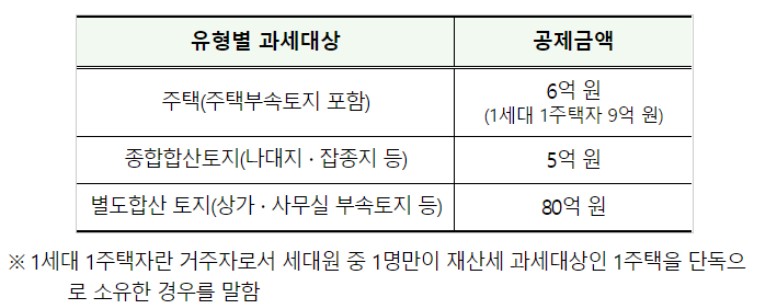 주택(주택 부속토지 포함) : 6억원(1세대 1주택 : 9억원)
