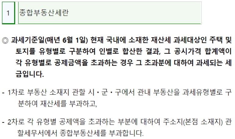 종부세 : 국내에서 대한 재산세 과세 대상인 주택 및 토지의 유형이 일정한 기준을 초과하는 경우 국세청이 별도로 누진세율을 적용해 부과하는 세금