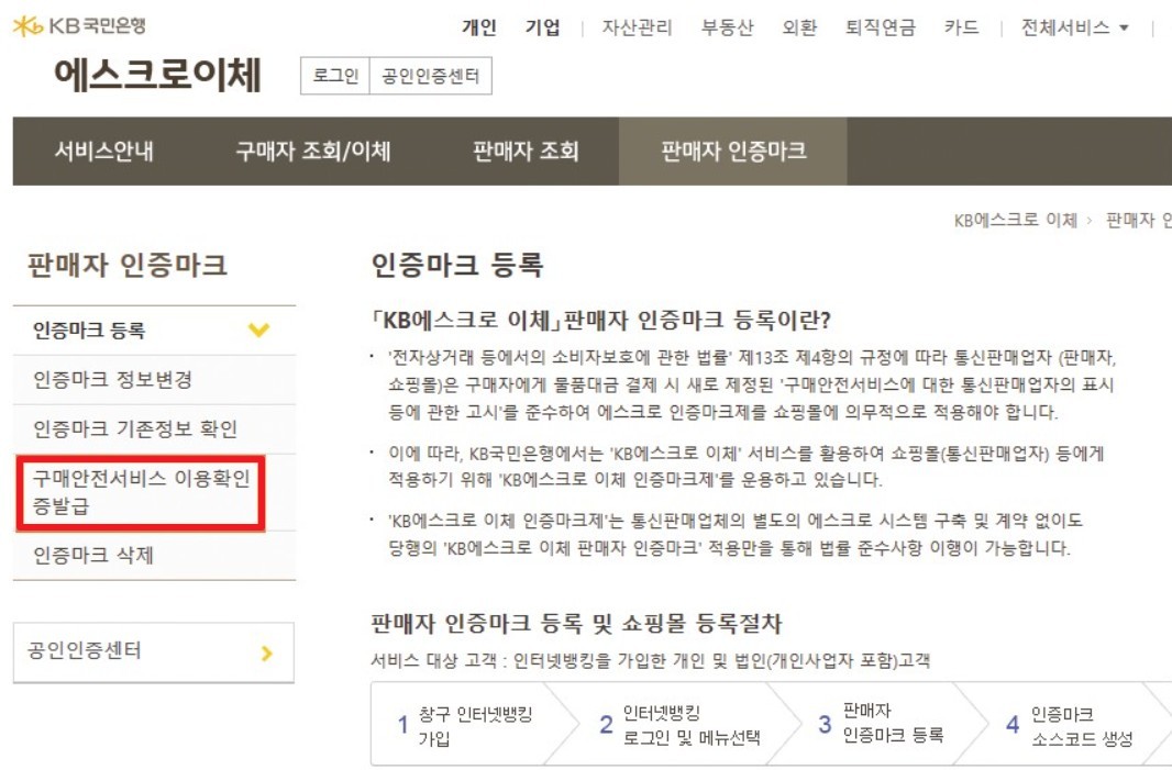 국민은행의 경우 전체 서비스 - 에스크로이체에 들어가면 판매자 인증마크를 등록할 수 있는 항목이 나옵니다.