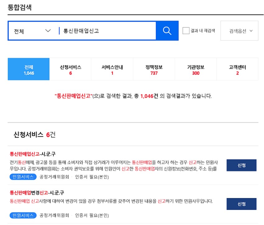 화면 중앙에 커다란 검색창이 보이는데요, 여기에서 통신판매업이라고 검색합니다.