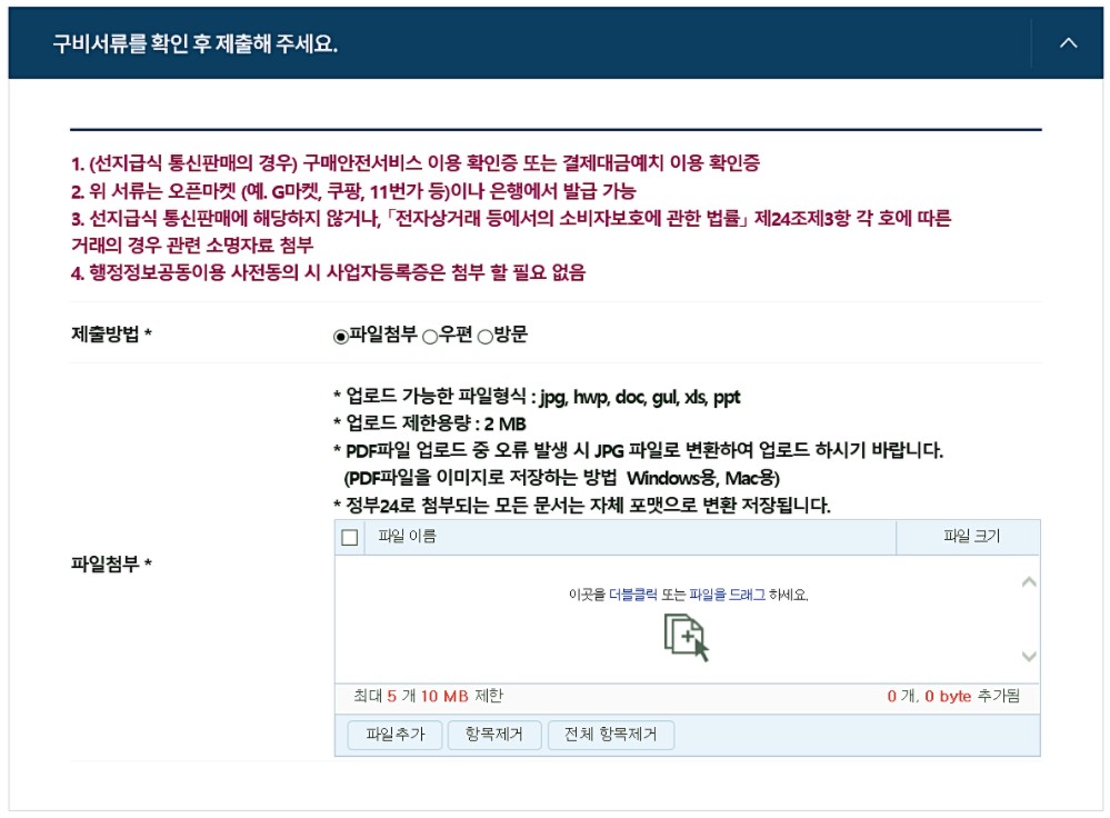여기에서 별도로 준비해야 하는 서류를 첨부해야 합니다. 선지급식 통신판매의 경우 구매안전서비스 이용 확인증 또는 결제대금예치 이용 확인증을 여기서 첨부해야 합니다.